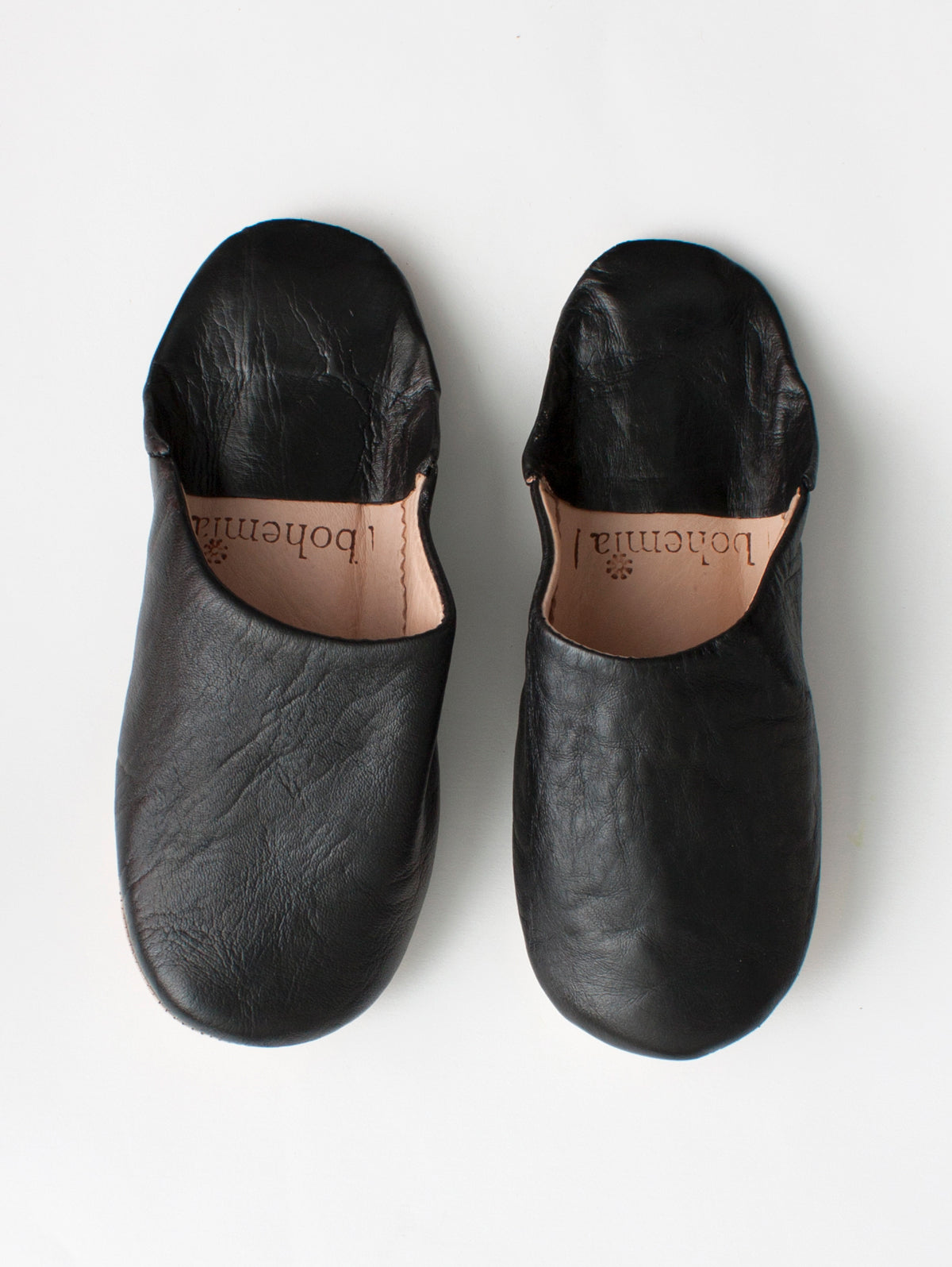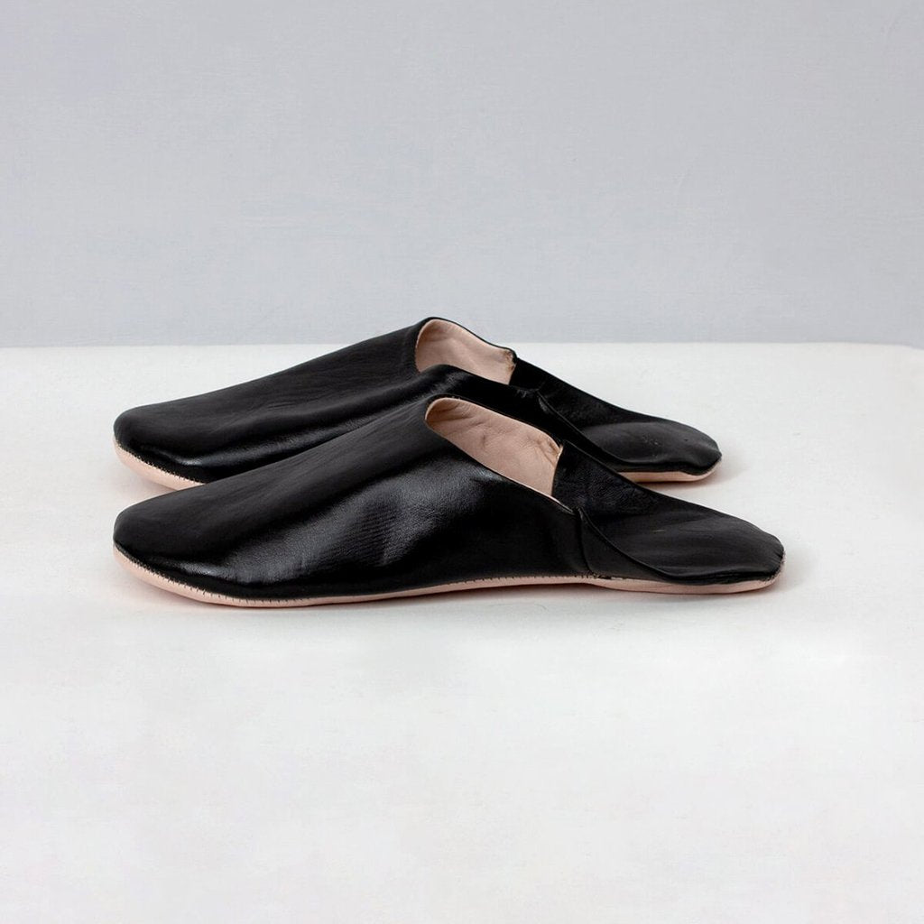 Moroccan Leather Babouche Slippers in black soft leather. Handmade using the traditional techniques of skilled leather artisans just outside of Marrakech.